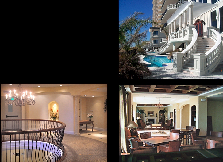 The Palms Club offers resort style luxury overlooking a Mediterranean setting on the Gulf with cast stone balustrade, columns, cypress arbor and radial cast stone staircases... leading to three pools, rockfalls and tropical landscaping at the pool decks.